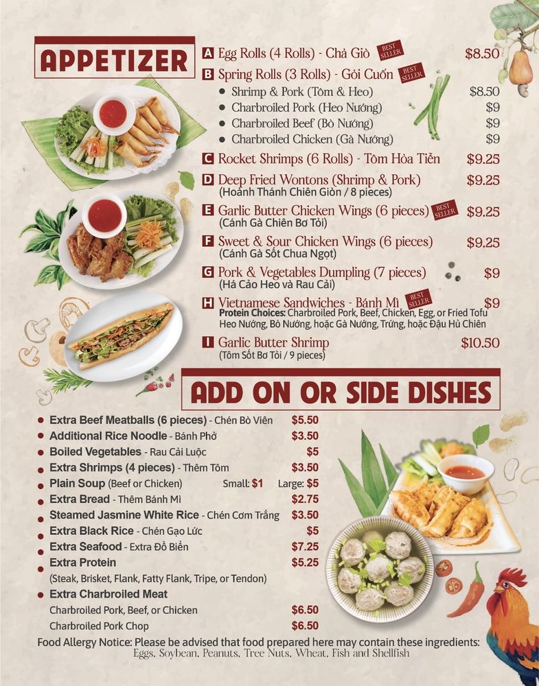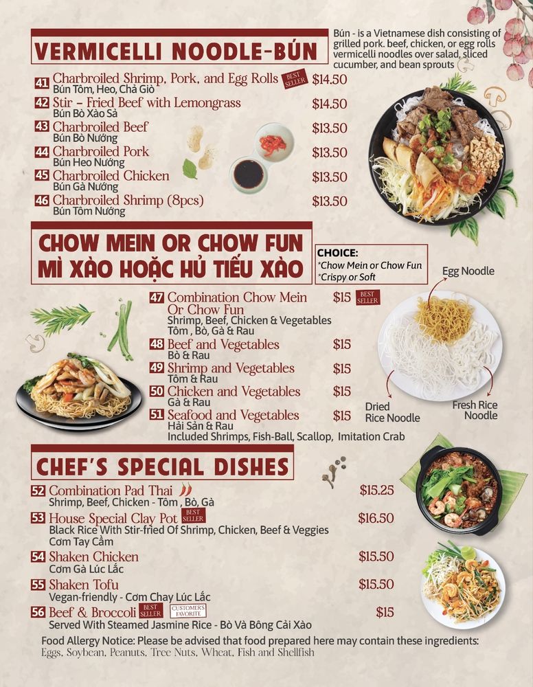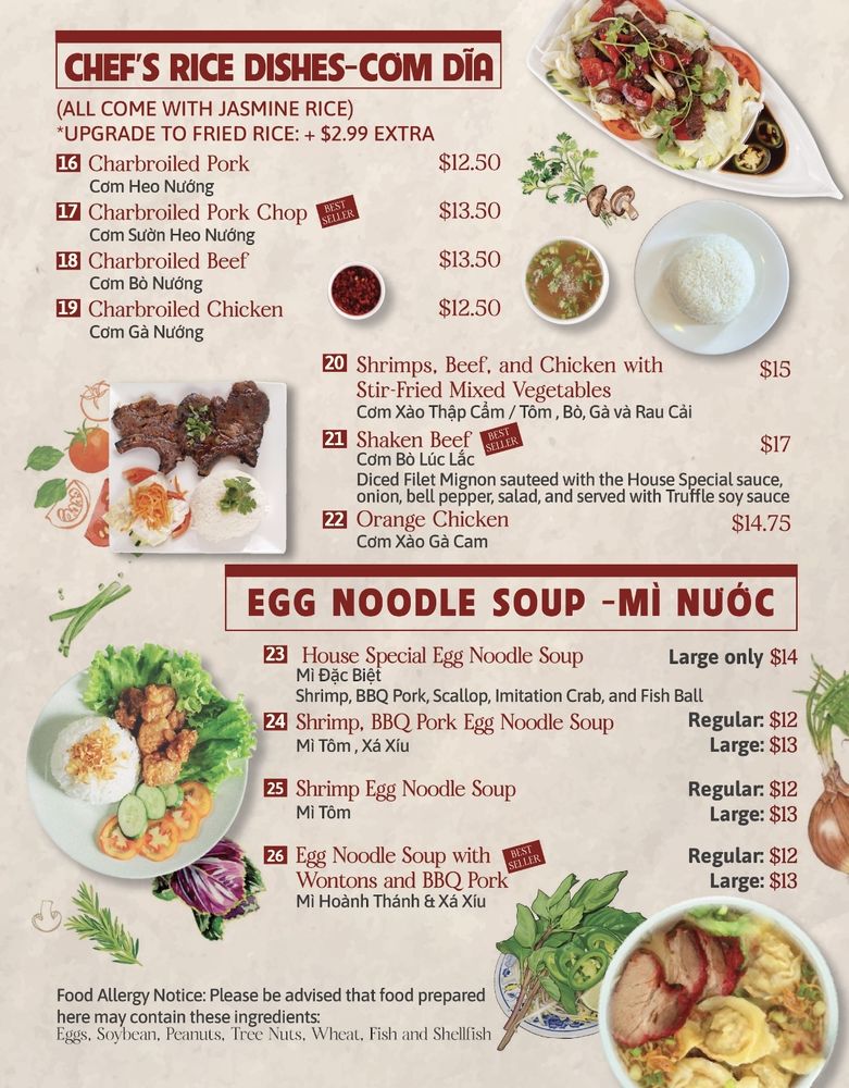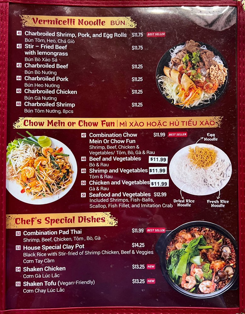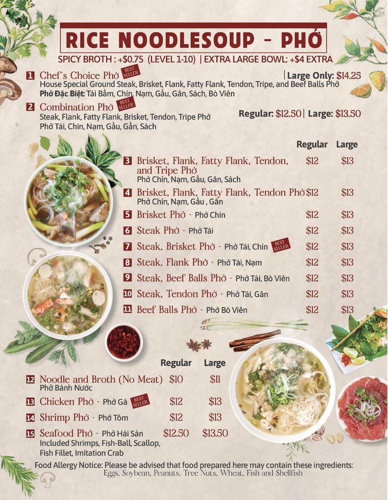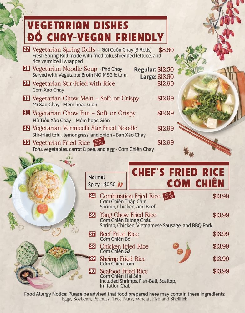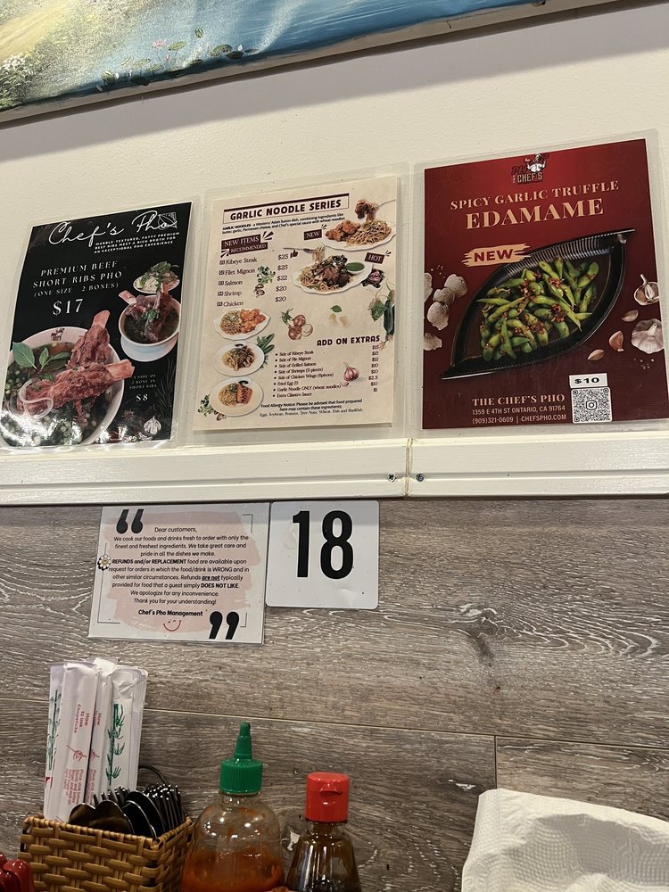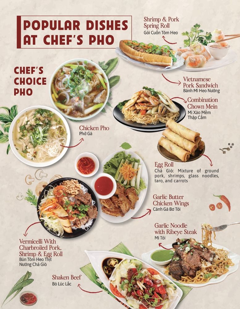 "The Chef’s Pho" is a Vietnamese and Asian Fusion restaurant located in Ontario, CA. They offer a variety of noodle dishes with vegan and vegetarian options available. Customers rave about the flavorful and satisfying meals, with big portions and a refreshing feeling afterwards. The service is top-notch, with friendly staff and a welcoming ambiance. The pho soup is a standout dish, consistently impressing diners with its well-textured noodles, tender meat, and balanced broth. The menu includes a helpful guide to different types of meat cuts for those looking to try something new. Overall, "The Chef’s Pho" is a cozy and crowded spot that delivers delicious food and excellent service, making it a must-visit for pho lovers.